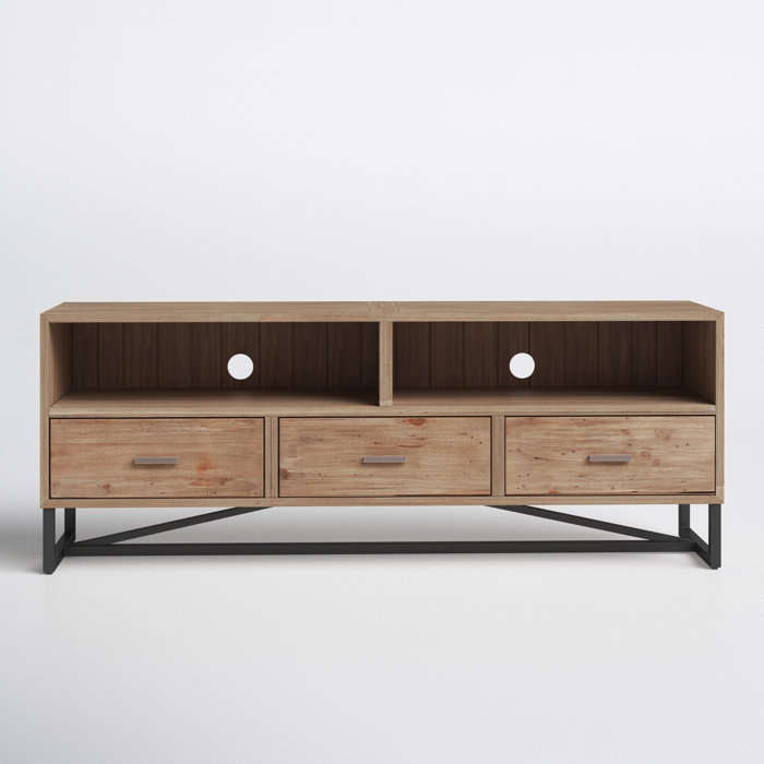 This TV stand boasts ample storage options and a clean-lined design fit for living rooms of all styles. It's made from solid and engineered wood and sits on a black metal base. The natural brown finish shows off the wood's unique grain color variation as well as the exposed wood knots. With three drawers, two storage compartments, and cable management cutouts, this TV stand has everything you need to keep your entertainment essentials in one place ? and organized. It's suitable for TVs up to 70-inches and arrives fully assembled.